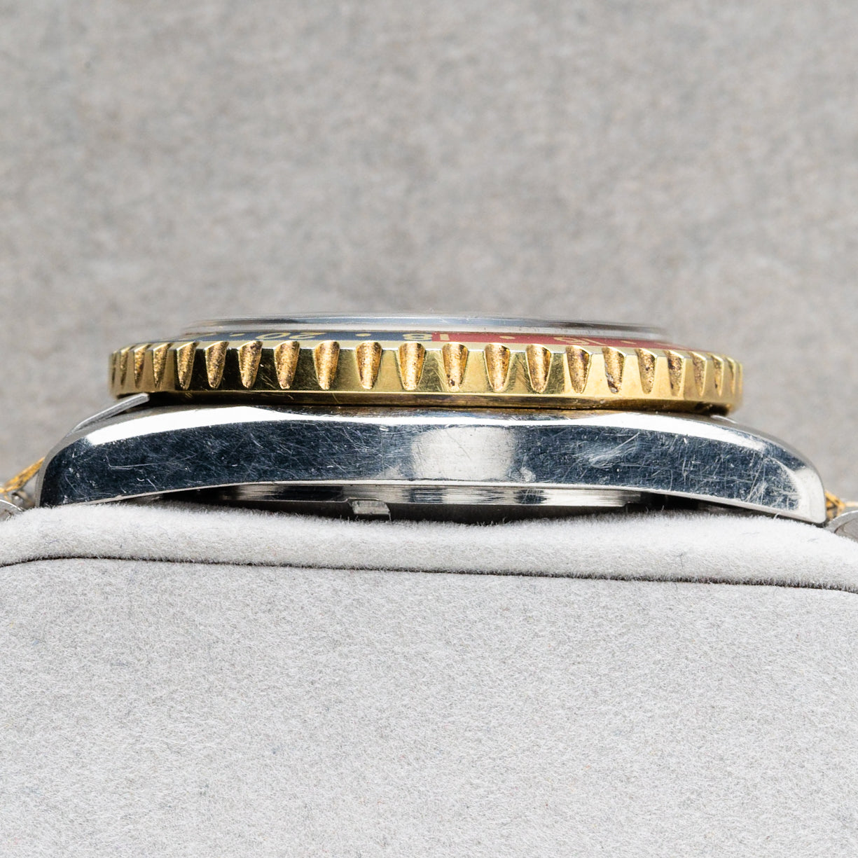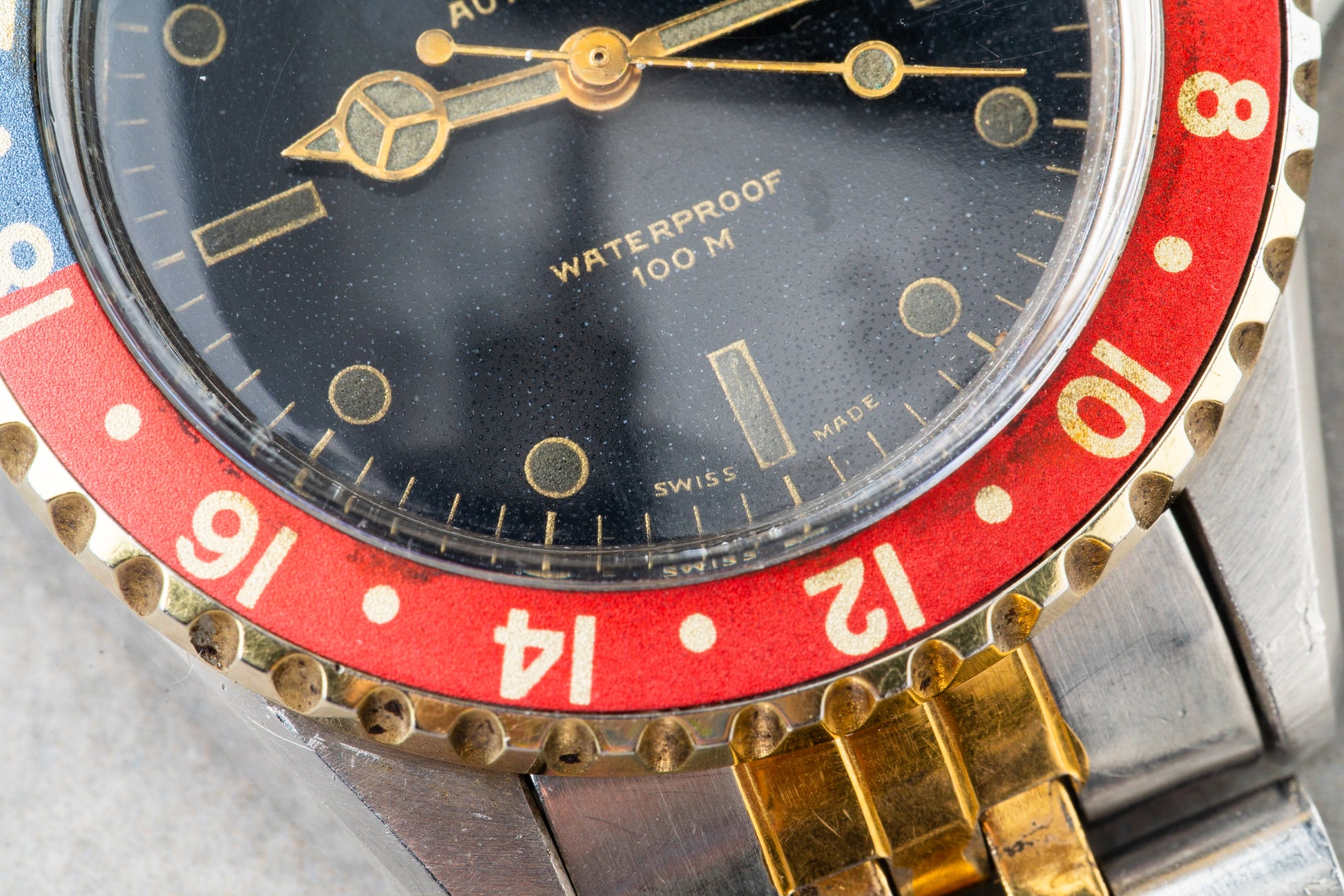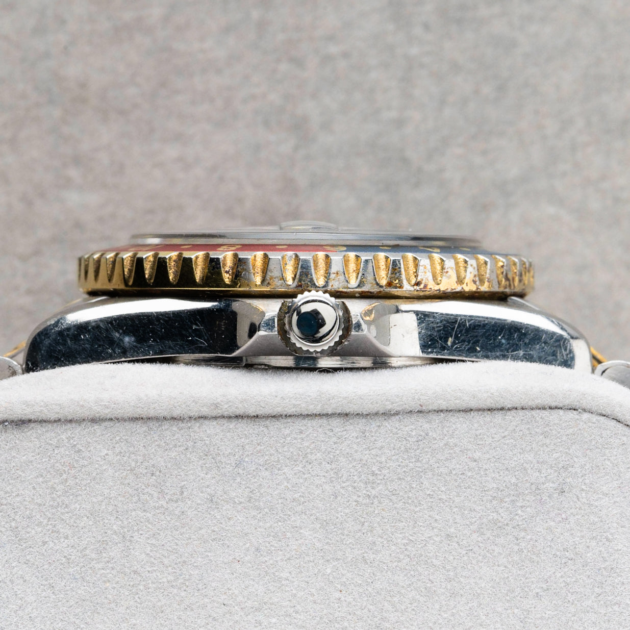 Points of Mention - Crown is a replacement, Speckled Patina on Dial with blotching "please see photos", Faded Pepsi Insert, Gold plating wear on bracelet & bezel