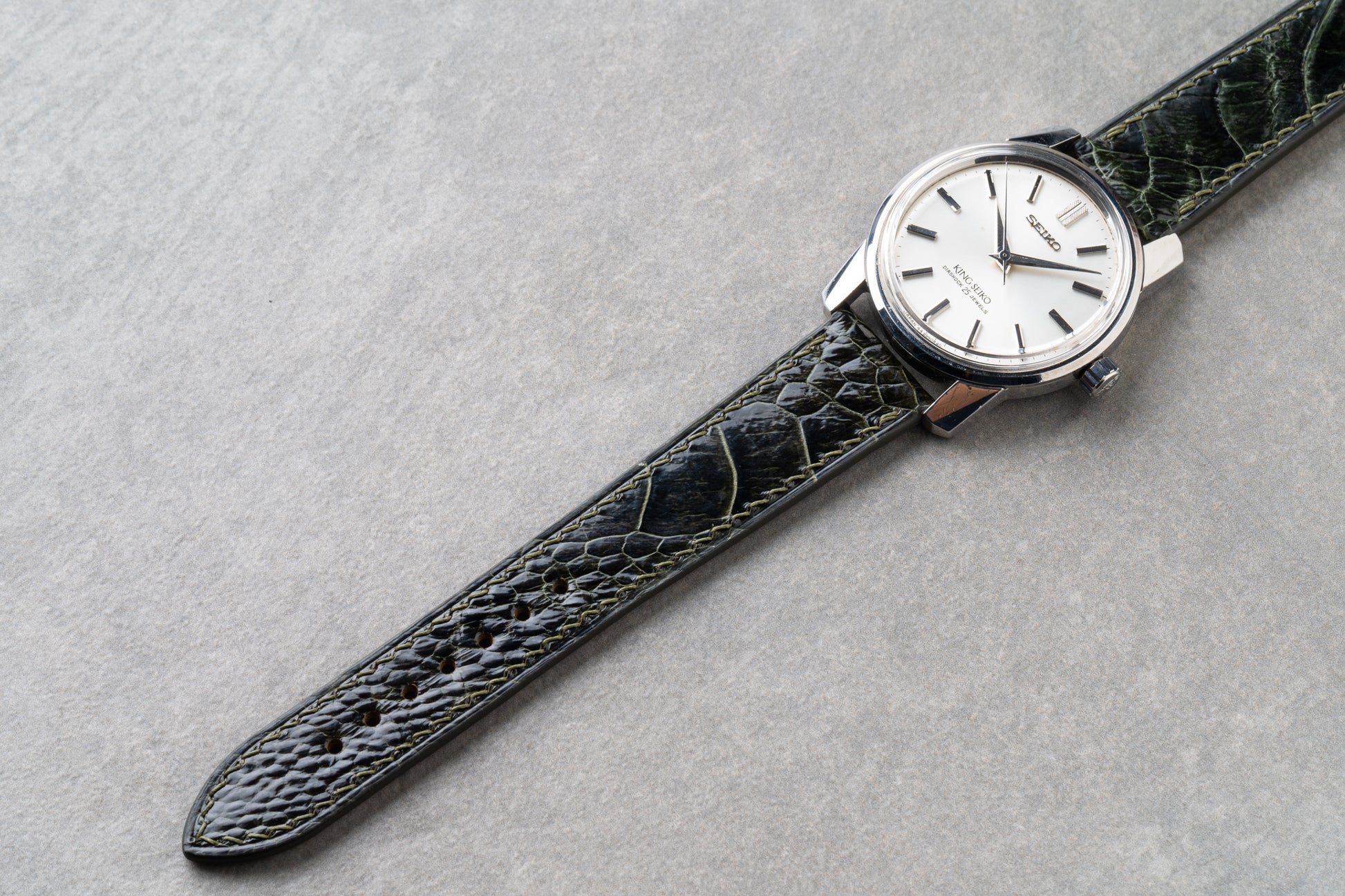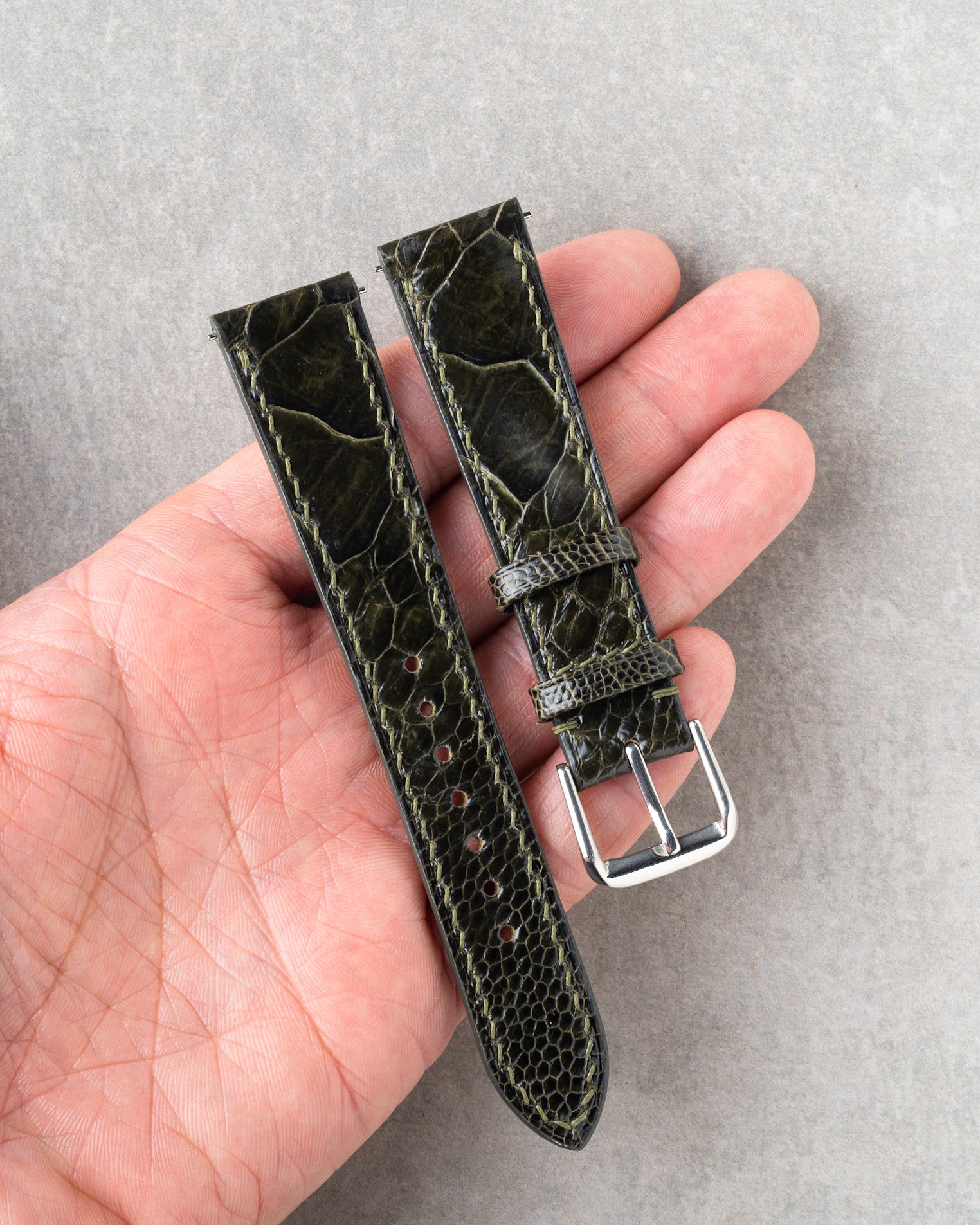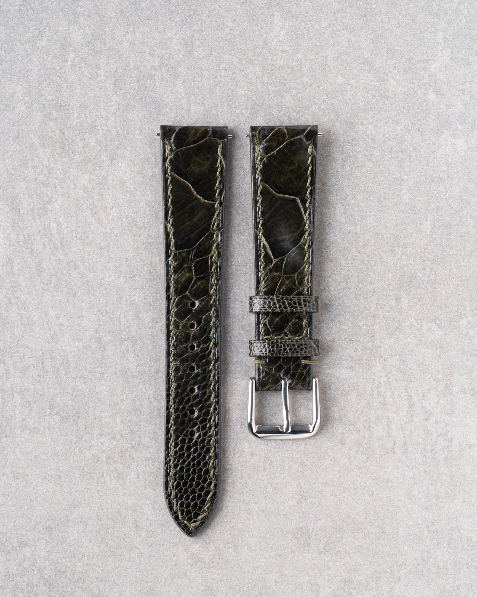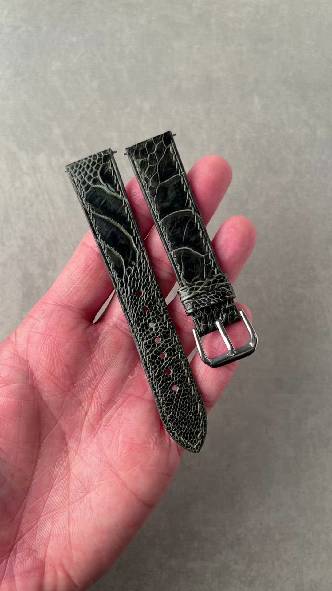 Genuine Ostrich Leg Leather Watch Strap in Myrtle with Olive Stitch